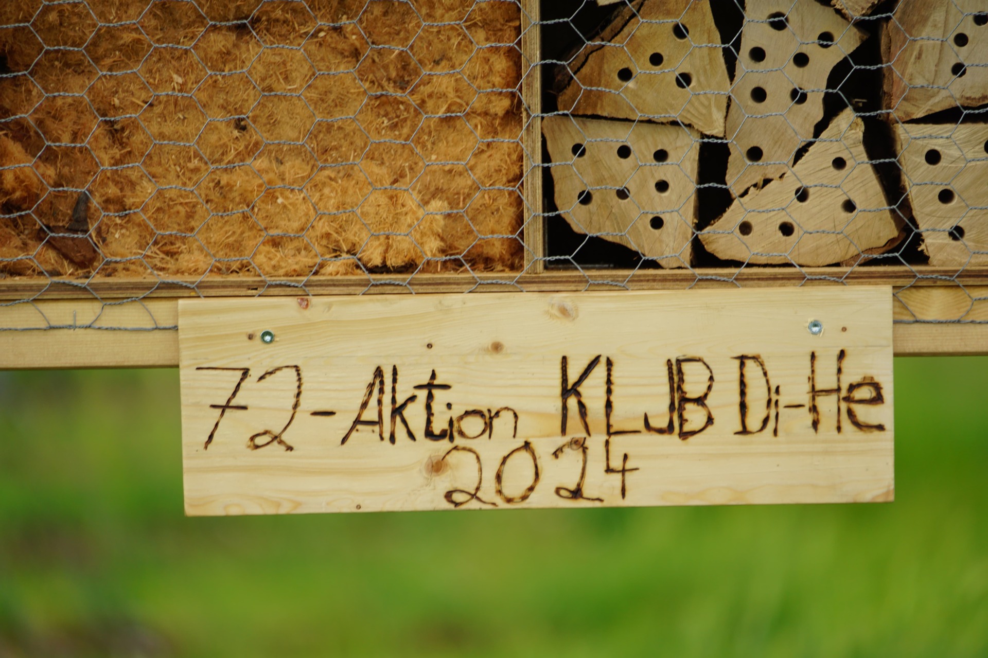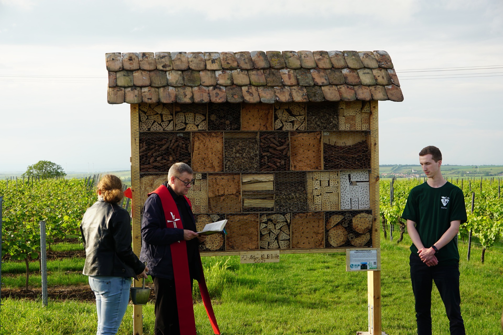 Kurz nach 19 Uhr an diesem lauen Frühlingsabend hat sich eine Menschenmenge vor dem Insektenhotel versammelt, die Eröffnungsrede gibt schließlich den Startschuss für die Einweihung und spätestens jetzt auch für alle Insekten im Umkreis. Unser Pfarrer Thomas Hoffäller segnet das Insektenhotel und so steht dem Buffet, wie auch dem hoffentlich langjährigen und erfolgreichen Bestand des XXL-Insektenhotels der KLJB Dittelsheim-Heßloch nichts mehr im Wege.