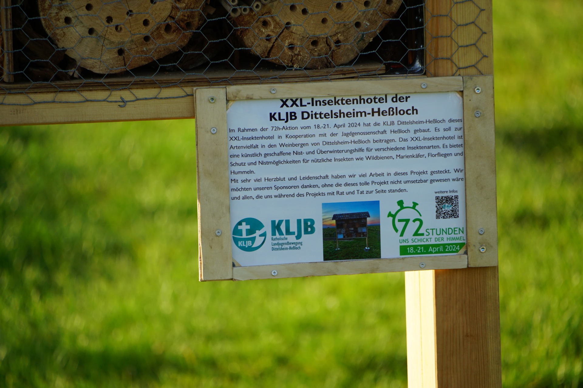 Kurz nach 19 Uhr an diesem lauen Frühlingsabend hat sich eine Menschenmenge vor dem Insektenhotel versammelt, die Eröffnungsrede gibt schließlich den Startschuss für die Einweihung und spätestens jetzt auch für alle Insekten im Umkreis. Unser Pfarrer Thomas Hoffäller segnet das Insektenhotel und so steht dem Buffet, wie auch dem hoffentlich langjährigen und erfolgreichen Bestand des XXL-Insektenhotels der KLJB Dittelsheim-Heßloch nichts mehr im Wege.